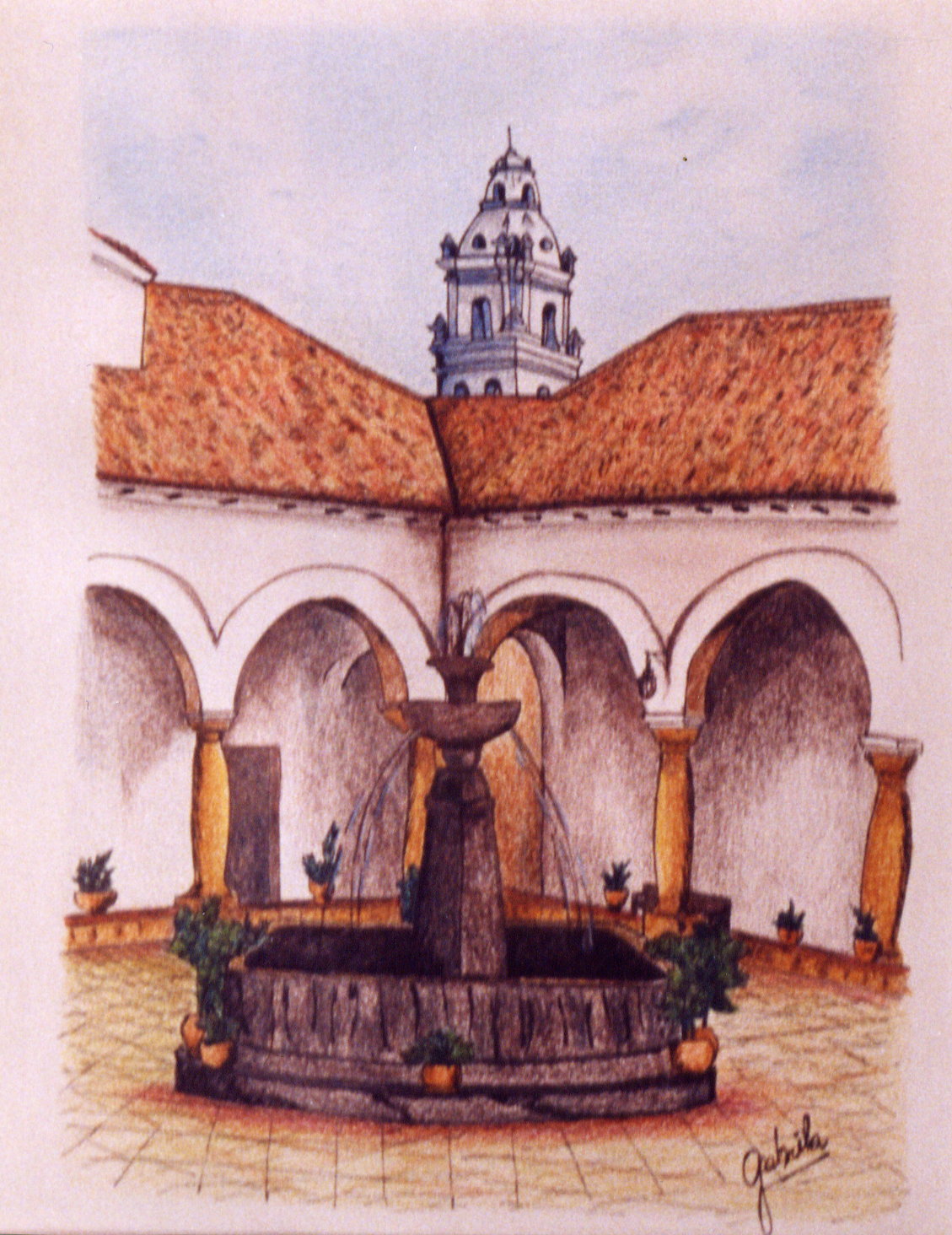 La artista captura aquí el encanto sereno de un patio colonial, con su fuente central y su arquitectura de arcos y tejas. La combinación de tinta y lápiz de color logra una textura cálida que realza la materialidad del conjunto: la piedra húmeda, la cerámica, los muros encalados. El punto de vista escogido —ligeramente elevado— invita a la contemplación y al recogimiento. Esta escena transmite no solo el valor estético del espacio, sino también su resonancia histórica, como testimonio de una arquitectura que preserva la memoria cultural del entorno andino.